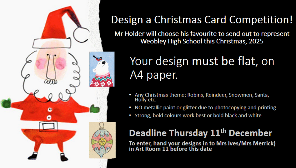 To enter, hand your designs in to Mrs Ives/Mrs Merrick) in Art Room 11 before this date